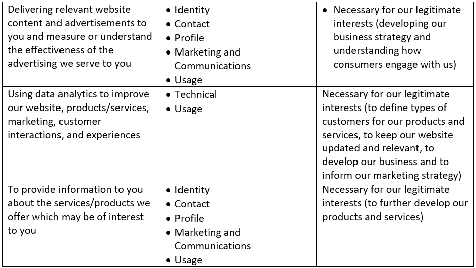 Monitoring our website usage and data, identifying trends, determining the effectiveness of our marketing efforts, and enhancing the functionality of our websites to assist us in expanding and developing our business activities;